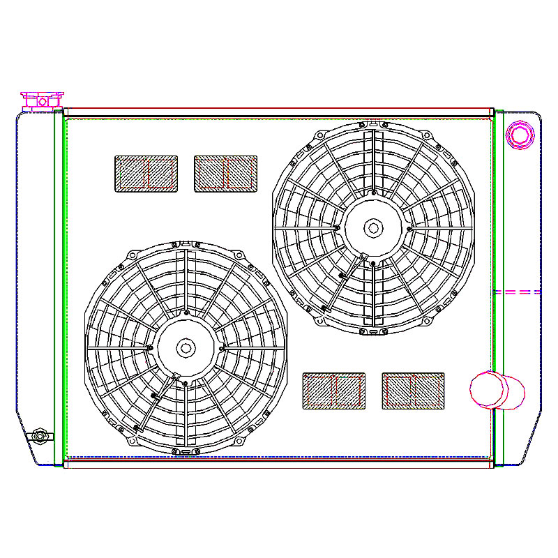 Description: ComboUnit 27.5" x 19", Dual Pass Right (Passenger), 2 Rows of 1.25" MegaCool Core Inlet #16 fitting ---- Includes: Radiator, Aluminum Shroud, Electric Fan(s) Optional Wiring Harness (PF-91CH) Sold Separately
