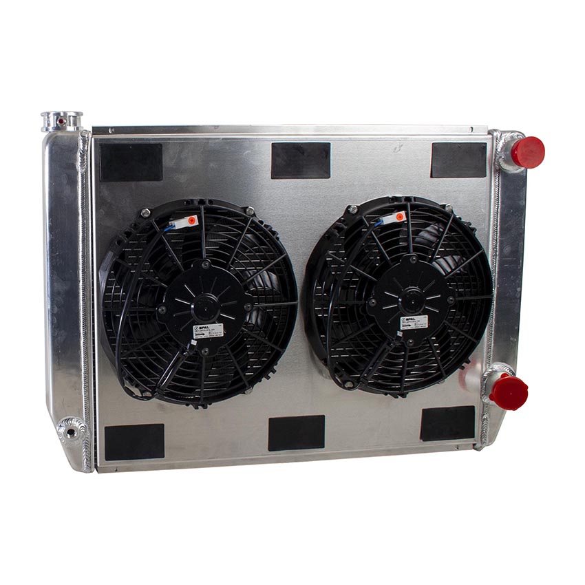 Description: ComboUnit 27.5" x 19", 2 Rows of 1.25" MegaCool Core Dual Pass Right (Passenger) ---- Includes: Radiator, Aluminum Shroud, Electric Fan(s) Optional Wiring Harness (PF-91CH) Sold Separately
